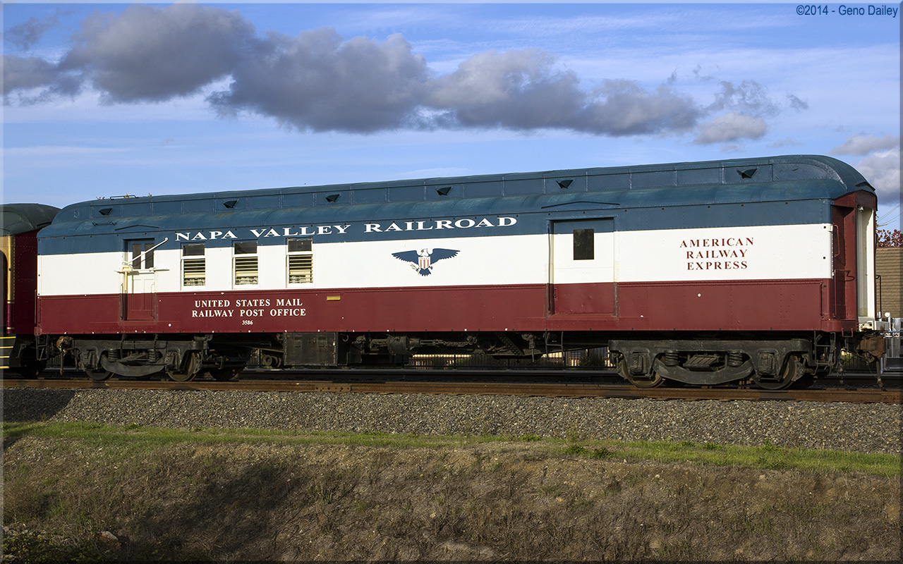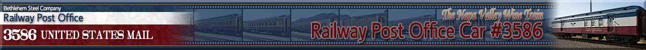 This car started its career as a United States Railway Post Office (RPO) car for the Cincinnati, New Orleans & Texas Pacific Railway which later became part of the Southern Railway. The Napa Valley Wine Train purchased the car in 1987 with the goal of historic preservation as this car is not part of the regular train's consist. Today, the car is a fully-equipped RPO. Historical information about this car provided by the Napa Valley Wine Train as well as the Northern Alabama Railroad Museum in Huntsville, AL who owns sister car #3585. |