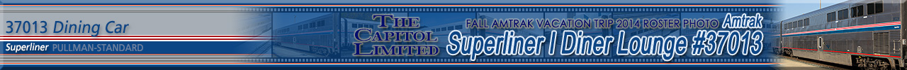 Built in 1981 as a Dining car. Converted to a Diner-Lounge configuration to allow the car to be used as a Dining Car and Lounge Car in the same car. Diner-Lounge conversion was completed in 2008 and the car renumbered 37013. Historical information about this car provided by www.amtrakbythenumbers.com. |