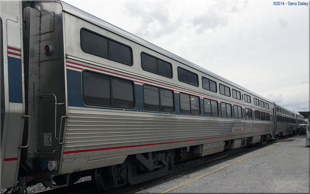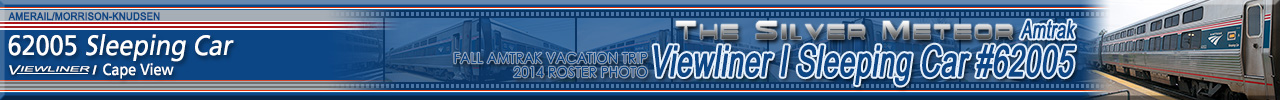 Built in April 1996 by Amerail as a single-level Sleeping Car and originally named "Cape View". As seen in the above photo, in Phase IVb paint, there is no name on the car any longer, being replaced simply with the word "Viewliner" and its car number. Historical information about this car provided by www.amtrakbythenumbers.com. |