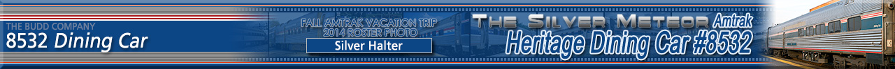 Built by Budd in 1956 for the Chicago, Burlington & Quincy Railroad as a 50 seat Coach. The car was conveyed to Amtrak in 1971 and renumbered 5016. It was later converted into a Cafeteria Car and renumbered 8716. Converted to HEP from Steam Heat in November 1985. Since 2001, it has operated as a Heritage Diner with the full Timoinsa Rebuild interior. Historical information about this car provided by www.amtrakbythenumbers.com. |