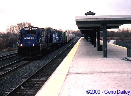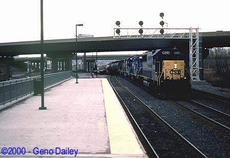 At 12:10pm, this Eastbound Manifest arrived with solid CSX power, now the norm on the Chicago Line. With AC4400CW #9041 on the lead, this train heads past the station on Track #2.