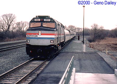 Next up is Amtrak Train #63, the Toronto-bound "Maple Leaf" still sporting F40 power. Today's train had unit #265 and its standard 4 coach 1 cafe car consist but with 2 Heritage coaches. The train is seen pulling into Syracuse at 12:34pm.