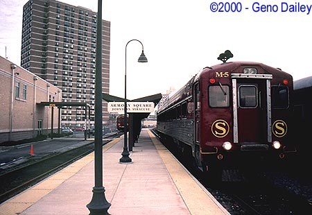 At 2:01pm, at the Carousel Center Entrance on the On-Track Commuter train, we see an RDC waiting at the platform minutes before departing for Downtown Syracuse and Syracuse University. This train service is operated by the New York, Susquehanna & Western Railway and operates Wednesday through Sunday.