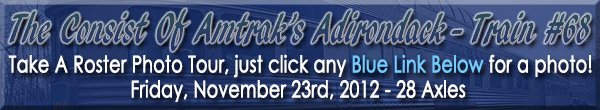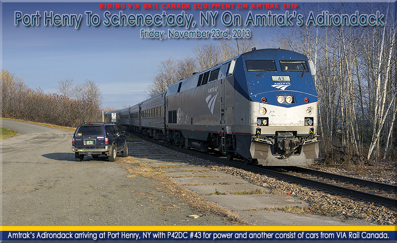 At 4:58pm, running now only 8 minutes late due to schedule padding, Train #68 arrived in Schenectady. I said goodbye to the passengers I rode with up to Port Henry today, and my friend and I got off the train. I got a quick couple photos of it as it left the station using the little flash on my camera before heading to a nearby restaurant as I had been living on Diet Pepsi since breakfast! We headed to a place called “The Recovery Room” a sports bar in nearby Rotterdam, NY. The food there is excellent and they have lots of TV’s showing lots of sporting events!!! After getting back to the station, my friend and I just hung out on the platform with a handful of other passengers waiting for the next train, Train #49 - The Lake Shore Limited to arrive which would be my train back to Buffalo. And now, here's a set of photos taken on the ride back to Schenectady from the Park Dome car, enjoy...