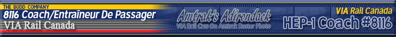 This car was originally built as a 62 seat coach for the Canadian Pacific Railway, numbered 116 and later conveyed to VIA Rail Canada and converted into an HEP-1 Coach and renumbered 8116. Historical information about this car provided by