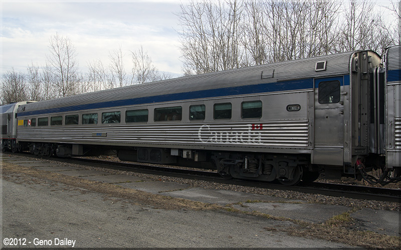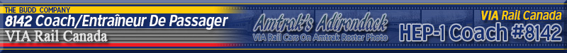 This car was originally built by Budd in 1946 for the Pennsylvania Railroad as a 62 seat coach and numbered 4055. The car was later operated by Penn Central (same number) and conveyed to Amtrak in 1971 and numbered 5434. Amtrak retired the car in April 1983 and the car was eventually sold to Eagle Canyon Tours who operated it until 1990. VIA eventually acquired and rebuilt the car into an HEP-1 Coach and numbered it 8142. Historical information about this car provided by www.passengercars.info and www.amtrakbythenumbers.com.
