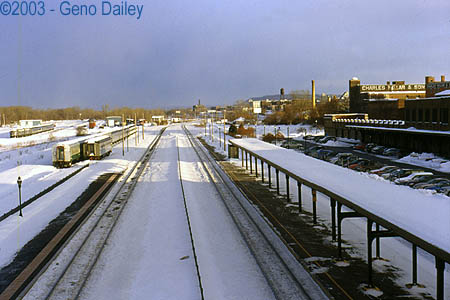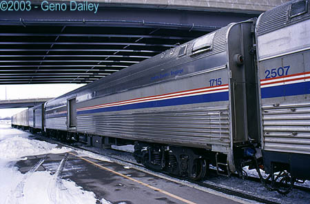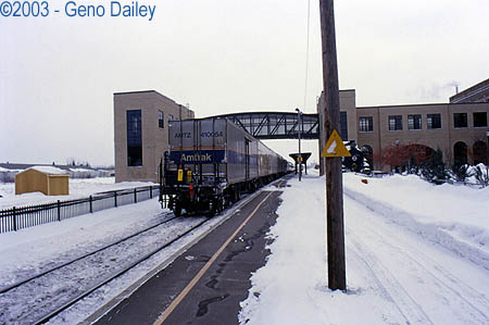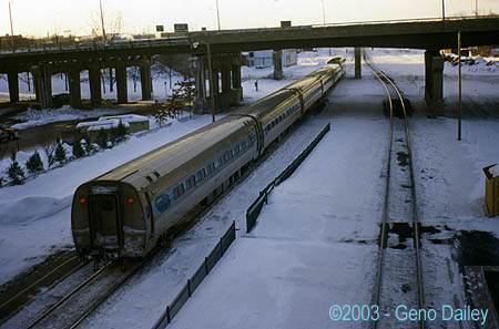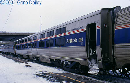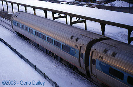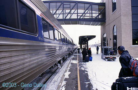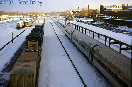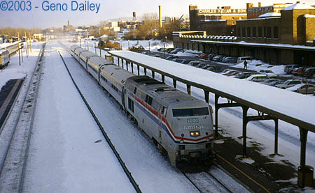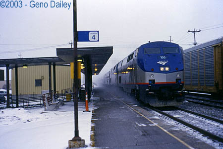 For my first trip in 2003, I thought I should head back to Utica again as I was here back in December to do my Christmas Shopping. This trip would be simpler than the last one as a stop in Syracuse wasn’t necessary so I could spend my entire time here. There was a store in the nearby Sangertown Mall called “As Seen On TV” that I wanted to visit again as I had spotted the store on my last trip but had less than 5 minutes to actually check out the place! I also wanted to get in some Trainwatching if time permitted at Utica. Amtrak was running a 25% Off Special available both on the web site and over the phone so I purchased my ticket from Buffalo-Depew to Utica for Train #48 – The Lake Shore Limited for $34.50 online. My ticket for the return trip on Train #49 was a Rail-Sale Seat available online only that I was able to get for the incredibly unbelievable low price of $6.20! I arrived at the station in Depew at around 6:45am (Thanks Dad for the ride!) and headed inside right away to pick up my tickets as they were purchased online for pickup at the station. I was surprised to see 2 of my former grade school teachers waiting in the station for the same train I would be riding. I picked up my tickets from the agent and went over to chat with my former 5th and 6th grade teachers who were headed to Croton-Harmon to visit family. The agent told us that Train #48 was set to arrive somewhere near 8:30am, so I headed to the vending machines to pick up some generic twinkies and a bottle of orange juice. At about 8:20, I headed outside to the platform to get set up to take a slide of the train as it had arrived. The crew bases for the Lake Shore have been moved and now a new crew generally takes over in Buffalo instead of Cleveland. The conductor on the train this morning was one that I rode with back in December, so we remembered each other from that trip. It was snowing and the temperature was probably 10 degrees if that, this would become a factor as it would have an impact on just about everything for the train and for myself as well. At 8:27am, Train #48 arrived with P42DC's #166 and #190 for power. The consist for today's train is shown at the bottom of this page. I rode in Amfleet II Coach #25115, a non-refurbished coach with the old red interior. This car had 2 broken toilets due to the sickeningly cold temperatures that the train had to endure for the entire trip. Thankfully, bathrooms were located in the next coach just as you walked in the door and were functioning normally. This unfortunately is something that Amtrak has to deal with when temps get to near zero in the Winter as pipes under the car can freeze which could cause a bathroom to be out of service. Due to all the snow the train was kicking up, the vestibules between coaches became filled with a decent amount of snow! Talk about walking in a “Winter Wonderland”, thankfully, there was rock salt placed on the floor in the vestibules where people walk so it would be safe for people to walk throughout the train. I took an aisle seat on the right side of the coach as I thought the window seat was taken by another passenger who wasn’t there when I boarded. I would come to find out later on that when the tag over the seat was placed in a horizontal direction over both of the seat numbers, then that tag meant that it was two people traveling to the same city. A tag was placed over my seat and I took the aisle seat not knowing it was already taken. Shortly after leaving Depew at 8:35am, 1 hour and 35 minutes late, I headed to the Dining Car, a Temoinsa Rebuilt Heritage Diner with an absolutely beautiful interior. I have always thought that these were some of the nicest dining cars that Amtrak has, though I found out from one of the servers in the car that these cars are not well liked by the crews as the work area is smaller due to the “bar” that was placed in the car, which is only used by the crews I might add. I was seated with a passenger on his way back to Boston. I had the French Toast as their griddle wasn’t working in the car so they had no pancakes. I also had a side order of Sausage and Home Fries with a Diet Pepsi to drink. The food was fresh, hot and delicious! Amtrak has definitely gotten it right when it comes to the dining car food and I’ve always said this as I’ve had several good meals in the dining car over the years. Shortly after breakfast, they closed the car down as breakfast service was over. I headed back to my coach seat to find it occupied by another passenger, I reported this to the car host and was given the rude response “What do you want me to do about it?” I ended up finding another seat on the opposite side of the car and moved my camera bag and jacket. As far as the rude remark from the car host, this is one problem that Amtrak needs to address, I work in customer service so I know that you have to treat your customers like royal if you want them to return. Rude remarks like that will only turn people away and obviously, that’s not what Amtrak wants. I personally wouldn’t let a rude comment ruin a trip for me, but it is something I tend to remember, and in many cases is one thing that will negatively stick out in someone’s mind if they’ve had a bad trip or a similar bad experience. I understand that the crews are under a lot of stress right now because of the funding situation that Amtrak is in but making rude comments in front of passengers won’t increase ridership and could leave a bad taste in the mouths of passengers. We left Rochester at 9:45am, gaining 4 minutes but still running 1 hour and 35 minutes behind schedule. I would find out later on that this was caused by unknown “equipment problems” in Chicago. I met a couple railfans in the coach next to mine who were headed to New York and had all their railfan gear with them. I had my scanner hooked up to an earphone for the entire trip to hear the detectors and such as I generally do during all my trips. On