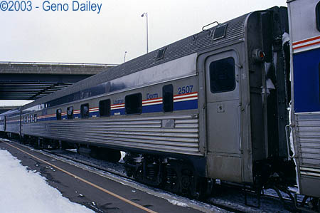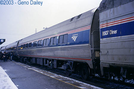 ![]() Amfleet II Coach #25015, one of the first to be repainted in the new "Phase 4B" paint scheme. This is very similar to the "Phase 4" scheme only the blue color is a bit more teal shaded and the new Amtrak Logo with new lettering has also been applied, a very respectable paint scheme if you ask me! ![]() OK, this is what happens when a train runs several hundred miles through the snow! I had to get a picture of this as this vestibule was covered with about 5 inches of the white stuff! Thankfully, the train crew made sure that the actual walkway between coaches was cleared of snow and adequately salted. I must admit, this was one of the most unusual things I've ever seen on an Amtrak Train! ![]() An interior view of probably some of the absolute nicest Dining Cars in all of Amtrak's fleet. This is Heritage Diner #8507 featuring a complete Temoinsa Rebuild of its interior. The seats in these cars are very comfortable and the decor gives the car a 1950's retro look. ![]() This is a bar/seating area for the crew in the Dining Car. The Temoinsa Rebuilds have this feature though its not very well liked by the crews as it makes their kitchen area that much smaller. ![]() Looking down the main walkway around the kitchen area in the dining car. It's amazing what the talented crew can do with food in such a small space! ![]() Looking East towards Utica Union Station on a very cold Friday Afternoon. This photo was taken as soon as I got off the train. ![]() Viewliner Sleeper #62033 - "Scenic View" on our train's New York Section. During the Winter months, The Lake Shore only has 1 Viewliner in both the New York and Boston Sections. During the summer, expect 2 Viewliners on the New York Section with still 1 on the Boston Section. ![]() Heritage 10/6 Sleeper #2507. This car is now used as a Crew Dorm/Lounge. This car was built by Budd in 1950 for the Union Pacific Railroad as a 10&6 Sleeper "Pacific Northwest". Later UP #1428 "Pacific Northwest". Later Amtrak #2621 "Pacific Northwest", after its HEP Conversion, it became Amtrak #2893 "Pacific Northwest". ![]() Baggage Car #1715. This was a former Budd Coach that Amtrak converted into a baggage/mail car as part of a massive project in the late-1990's to expand its Mail & Express business. These cars do haul mail but are also used for baggage as well. ![]() Something I sincerely hope we don't have to continue looking at on the end of passenger trains! Amtrak is slowly phasing out its Express Freight business which hopefully will make ugly road railers like the one pictured above on the end of the Lake Shore, a thing of the past! ![]() This is an overhead view taken from inside the overhead pedestrian walkway that brings you to Track #2 (CSX Track #1). The little bit of trainwatching that I did today had to be done from inside here because it was WAY TOO COLD to spend any length of time outside! ![]() Now arriving on Track #2 is Amtrak Empire Service Train #281 with P32AC-DM #700 for power. This train would stay here a few minutes as the crew had a hard time getting a door to close all the way on one of the coaches. Train #281 runs every day between New York Penn Station and Niagara Falls. ![]() This CSX Freight passed by #281 before I got a chance to photograph its lead engine. If you follow the track the freight is on, you'll vaguely see in the above photo that the old New York Central Tower 30 is still standing and that line runs right next to it. ![]() Amfleet I Coach #82069. This was one of the Capstone Cars that Amtrak rebuilt in the late 1990's with more spread out seats and updated interior amenities. If they flawed on one thing, its that God-awful multi-shaded blue paint scheme! Thankfully, there are no plans to keep this paint scheme and as cars are shopped, they will get a nice coat of fresh Phase 4B paint as seen in the photo at the top of this travelogue. (On a side note, I rode in this car back in 1999 when it was Coach #21654!) ![]() Train #281 leaving Utica, this was the last photo I took due to the shortened winter day. This proved to be the coldest trip I've ever taken on Amtrak! |