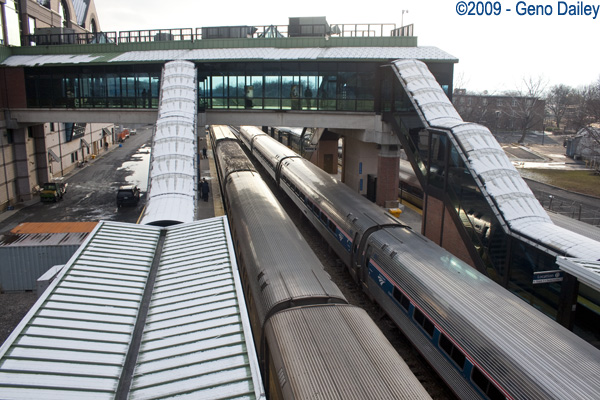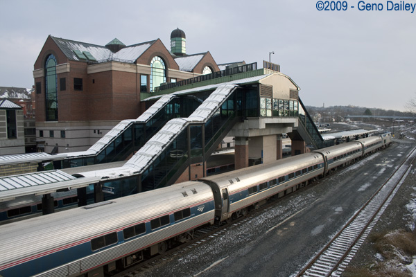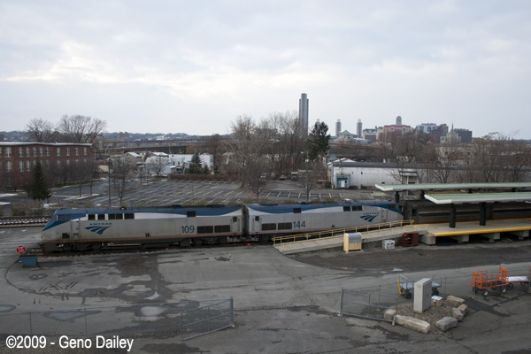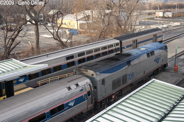 | Busy day at Albany-Rensselaer Station. Train #48, bound for New York is in the foreground with its lone P32AC-DM that is added to it once it arrives in Albany so as to facilitate running in the tunnels leading into New York Penn Station. The P32's are "dual mode" units meaning they can run either as a regular diesel locomotive or on 3rd rail electric. |