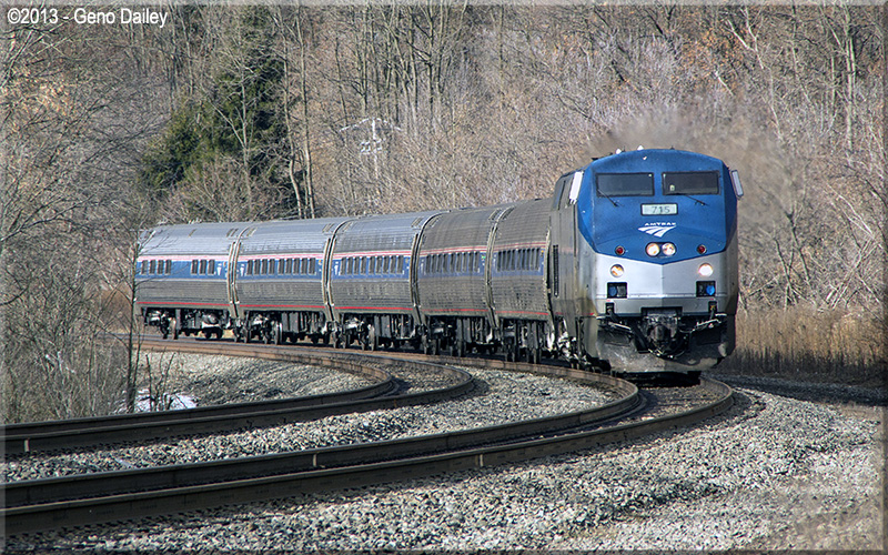 | At Amsterdam, NY, Empire Service Train #286 with GE P32AC-DM #715 leading, rounds the bend just before the Amsterdam stop. |