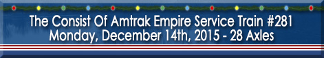 | After an excellent long weekend, it was time to head home. I had to have the rental car back by noon so I started the day by having breakfast again at Dunkin Donuts (I ate here more than once due to the convenience of it being next door to the hotel), then checked out of the hotel and drove back to Enterprise to drop off the car. They then drove me back to the Amtrak station where a friend of mine who works for Amtrak eventually arrived and would ride with me to Utica, then take Train #64 - The Maple Leaf back to Schenectady. I took a couple quick photos of Empire Service Train #284 when it arrived, then at 1:31pm, running 8 minutes late, Amtrak Empire Service Train #281 arrived to bring me back home to Buffalo. The consist for today's train is shown below: |