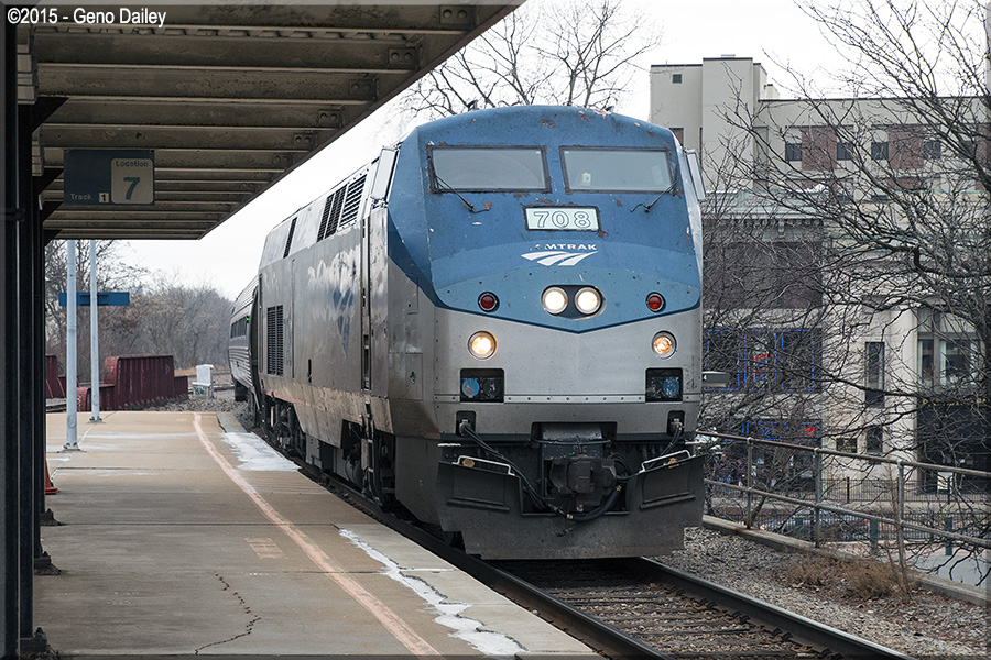 Amtrak Empire Service Train #281 arriving at Schenectady, bound for Niagara Falls with GE P32AC-DM #708 for power. |