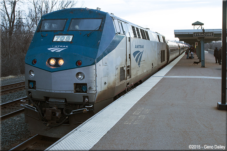 We departed Schenectady at 1:33pm, running 10 minutes late. We would cross over the Mohawk River just west of the station there and would eventually make our next stop at Amsterdam, NY at 1:51pm. Train #48 - The Lake Shore Limited would pass us during our very brief stop here (The Lake Shore doesn't normally stop at Amsterdam) and we also departed at 1:51pm, running 8 minutes late. Due to the unusually mild weather and lack of precipitation, I was able to take a few more photos from inside the train of the passing scenery. We arrived at our next stop of Utica, NY at 2:49pm where my friend got off the train so as to take Train #64 back to Schenectady. We departed Utica at 2:52pm, now 12 minutes late, but overall, not a big deal. Our next brief stop would occur at Rome, NY where we arrived and departed at 3:07pm, now 11 minutes late. There was a fair amount of freight traffic we had to contend with which would end up resulting in us following a slow CSX freight starting at CP-278 which is east of Syracuse. We would have approach signals for several miles and would pass Train #64 near CP-286. Today, that train had Phase III-pained P42DC #822 for power! I briefly chatted with our crew as we passed by DeWitt Yard and eventually at 4:05pm, we arrived in Syracuse. This is a partial crew-change stop for this train as we pick up a new engineer for the rest of the train's run to Niagara Falls. While the crew conducts their job briefing, passengers were allowed to get off the train and smoke or get some air, or if you're me, more pictures!!! We had a passenger on the train with a service animal, a Miniature Pinscher who would sorta "do his business" on the platform while we were there (ah, the life of a dog!), and at 4:13pm, we departed Syracuse now 33 minutes late having lost a considerable amount of time following a slow freight.