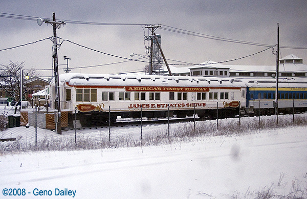 At the New York State Fairgrounds in suburban Syracuse, NY, this James E. Strates Shows passenger car sits in storage. James E. Strates Shows is the only carnival that travels by rail today. They also handle the Erie County Fair (County I grew up in) in Western New York every summer. |