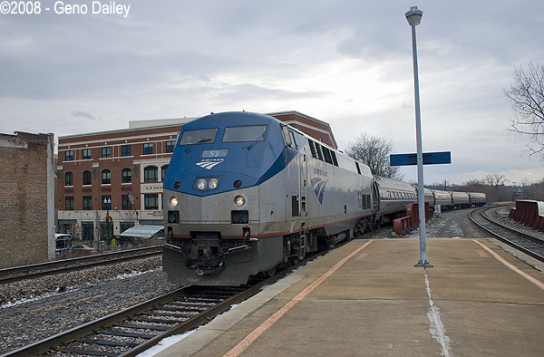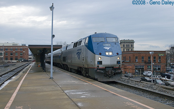 running over 2 1/2 hours late arriving into Schenectady with P42 #74 on the lead. This train is going to Toronto. |