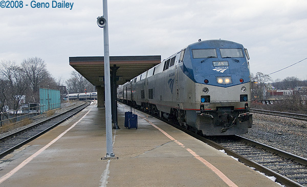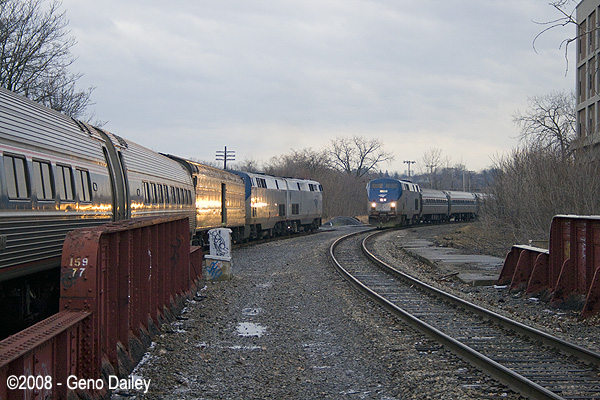 Here we have a meet of Train #48 on the left and Train #281 on the right coming into the station in Schenectady. Train #281 would be my ride home this year. |
