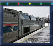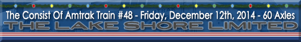I arrived at Buffalo-Depew Station around 8:45am. I got a quick picture of the new buffalo that is on display outside of the station. This time, it seemed rather fitting that the animal was covered in snow, something we're notorious for in these woods! During the week, a Nor'Easter had dumped anywhere from 8 to 12 inches of snow if not more, across a good chunk of the northeast including Buffalo as well as most of New York State. Thankfully, the storm was out of the area by the day of this trip, though it was delaying trains earlier in the week. I had been checking the status of Train #48 throughout the week and it had been arriving into Buffalo-Depew most days either on time or nearly on time which is a great thing as I haven't rode this train in two years and needed to get another ride on it again! I headed outside to the platform after picking up a Diet Pepsi in the station. At 9:00am, running 2 minutes late, Train #48 arrived at Buffalo-Depew Station. The consist for today's train is shown below: |