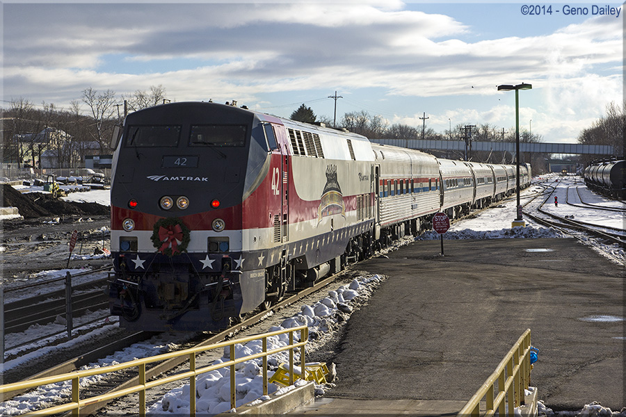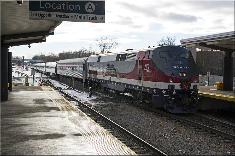Amtrak's "Santa Special" train arrives with GE P42DC #42 which has a paint scheme that is a salute to America's Veterans.