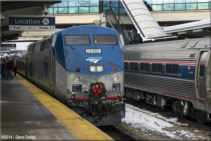 | P32AC-DM #716 was on the other end of the "Santa Special" decked out with its own wreath too! Train #284 is next to this train to the right of the photo. |