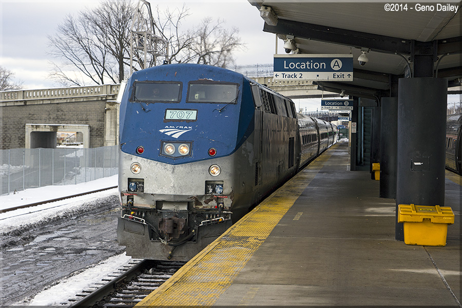 | Amtrak Train #292 - The Ethan Allen Express arrives at Albany-Rensselaer with P32AC-DM #707 on the head end. |