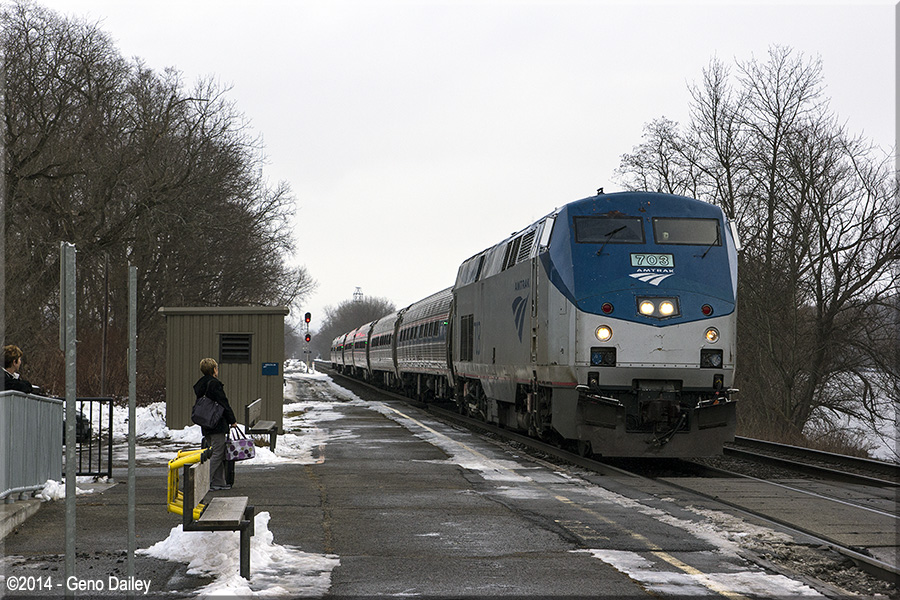 | Now arriving is Amtrak Empire Service Train #281, bound for Niagara Falls with P32AC-DM #703 for power. |