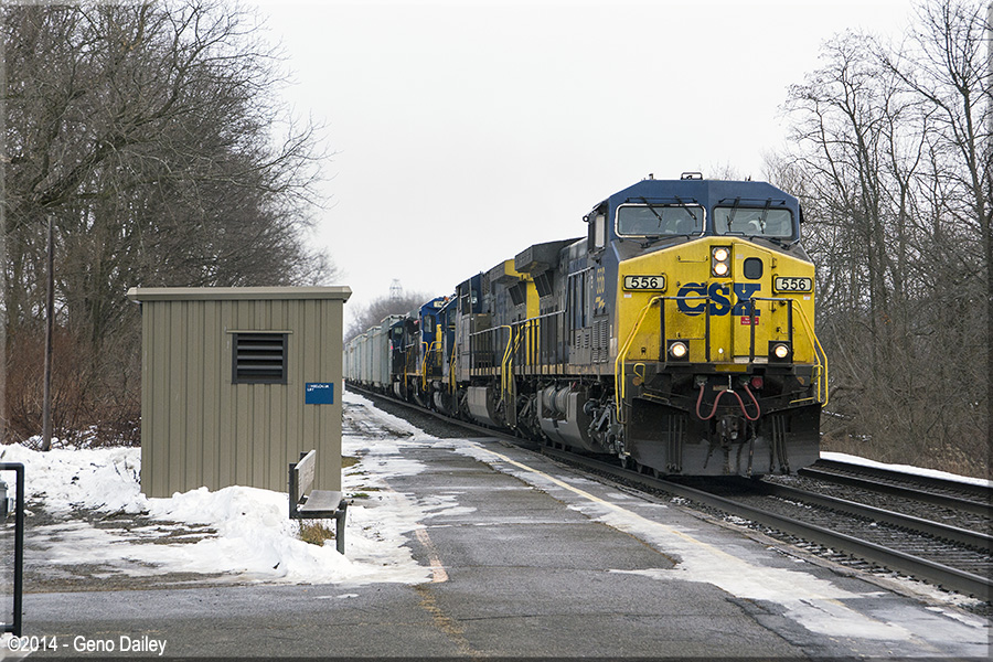 | Next up would be this westbound CSX garbage train with GE AC4400CW #556 leading a 4-unit consist. |