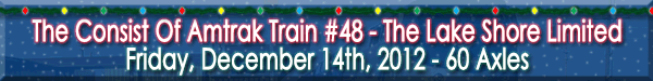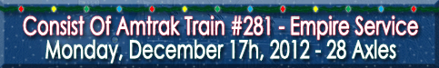 Unfortunately today, our country experienced a tragedy today in Newtown, CT as this was also the day of the fatal shootings at the Sandy Hook Elementary School. I kept the radio on while making the drive to Castleton to hear more info about this. My thoughts and prayers were with the families and those who lost their lives in that tragedy. The reason I made my first visit on this trip here to this small town south of Rensselaer, NY was to photograph Amtrak Empire Service Train #255 going around 110mph through here as a good friend of mine was the engineer on that train! You'll see the photo a little later on in the travelogue. After getting the photo, I drove back to Rensselaer and parked the car in the Amtrak Station's lot and met up with my engineer friend as his work day had just ended. I took a night photo of Train #49 with the Albany skyline in the background outside the station. I then took another photo of a combined train #49 and #449 from the bridge on nearby Broadway in Rensselaer. I then drove up to near a Holiday Inn Express hotel in East Greenbush to get a night photo of the Albany skyline from a nice high overhead location before having some good wings and a Buffalo Chicken sandwich at a sports bar next to that hotel. I eventually drove back to the hotel and picked up some bottled water and Diet Pepsi from the Sunoco station next door to the hotel and would start writing this travelogue and eventually call it a day. |