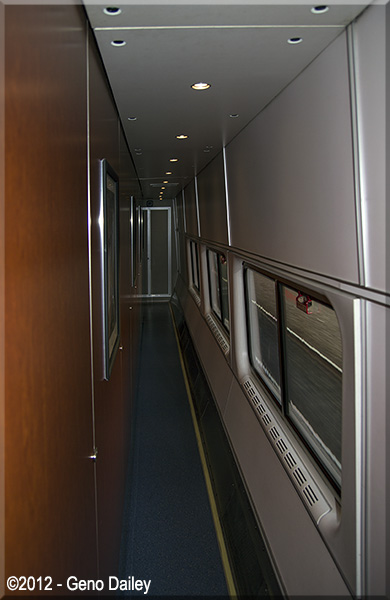 LEFT: A typical place setting in the Viewliner diner. RIGHT: The hallway around the kitchen leading back to the sleeping cars. |