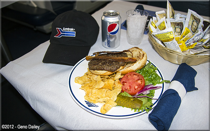 Time for lunch in the Viewliner diner! Today, I had the Angus Steak Burger with bacon and kettle chips with a Diet Pepsi, good eats!!! |