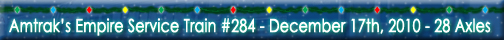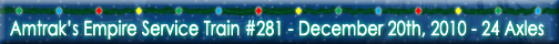 | I woke up and had breakfast at the nearby Dunkin Donuts. I then packed up my stuff and checked out of the hotel and drove back to Schenectady to turn in the rental car at Enterprise. I mentioned this in my last travelogue and I'll say it again here: If I could make one recommendation to anyone taking a trip like this: A GPS is a great tool to have. They easily mount in any car using a suction cup that likely will come with the unit (I have a Garmin Nuvi 255W and it came with one). I had no idea where some of the places I visited were located and I've had only so-so success with online map services in the past. There are many models of GPS units available and they don't cost an arm and a leg either! After arriving at Enterprise, I was given a ride back to the Amtrak Station and ventured up to the platform to see a late Empire Service Train #284, however my train, #281 would end up arriving first so I never got a photo of #284 and only got a "quick photo" of #281. We left Schenectady at 1:21pm, running 4 minutes late, no big deal there. The consist for today's train is shown below: |