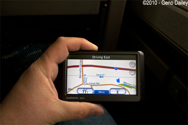 | My Garmin Nuvi GPS! Interesting how it shows a car riding on the tracks and the tracks are listed as "Conrail"! |