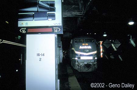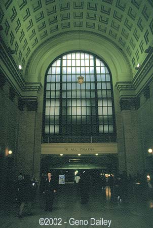 The following photos were taken inside and on the platforms of Chicago Union Station during my 3 hour layover of my trip. I will warn you that if you plan on taking similar photos on the platforms on a future trip, GET PERMISSION from a crew member FIRST!!! I was given permission by a couple of Amtrak crew members at the station to do this. There will be days where this isn't possible. All of the photos shown here were taken as I was heading TO California. On my return trip, I was denied permission to take any photos on the platform, but was thanked for asking first. If you are denied permission, don't complain, just grin and bear it, its not the end of the world.