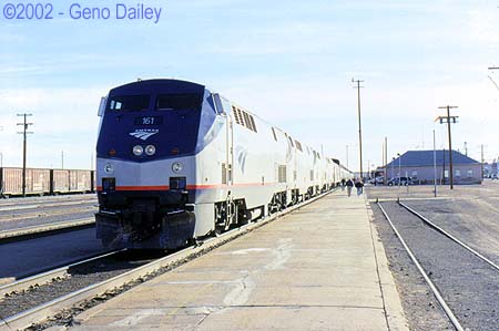 I went back to my coach, turned on my scanner (with an earphone attached of course). I also listened to a couple of MiniDiscs before realizing that some time had past and I'm still not asleep. (Maybe I got so tired I couldn't sleep, I don't know!!!) Ultimately, I did fall asleep, we passed through La Plata, Missouri at that time. I woke up again around 10:30pm just as we were pulling into Kansas City. We picked up passengers and the train took on water. Shortly after leaving KC, we were moved onto a yard track to pick up road-railers. I kept hearing the action on my scanner as we moved back and forth and back and forth again and again until the cars were connected and we could leave. All this time, I wondered why we had 4 locomotives pulling this train, I've seen Lake Shore Limited's carrying more cars than we had with half the power so this was interesting. I would come to find out later on that we needed every horsepower all 4 units could spit out to get over some of the coming hills. For the rest of the night, I slept, as we passed through Lawrence, Topeka, Newton, Hutchinson, and Dodge City, Kansas.