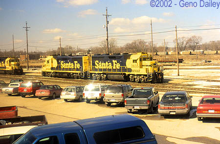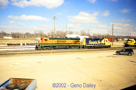 A repainted BNSF GE B23-7 #4266 leads GP35u #2538 sitting in the yard.