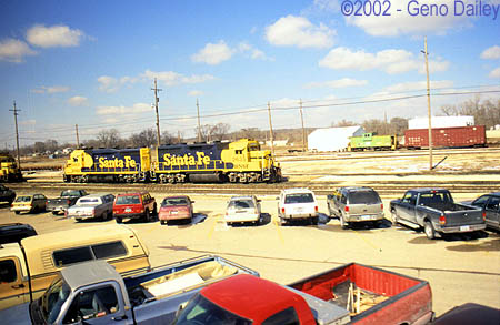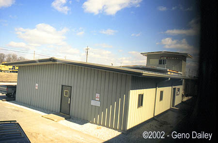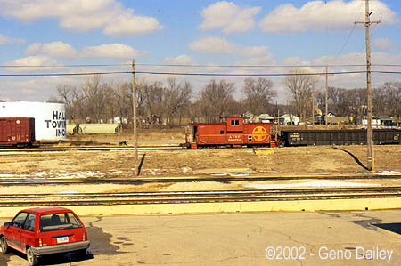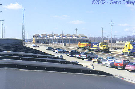 freight action in Fort Madison. A Material Handling Car's roof is seen in the foreground.