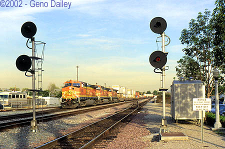 Framed between two signal lights is this BNSF freight with C44-9W #4562 heading north. BACK TO TOP: