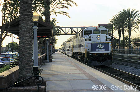 A southbound Metrolink Train with F59PH #851 on the lead at 4:30pm. BACK TO TOP: