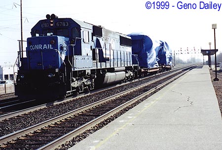Just before my train was to leave Buffalo, this snuck up on me!!! Here is SD50 #6783 pulling what looks like 2 generators, I'm not sure what they were for or where they were going. |