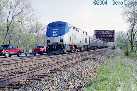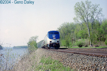 On May 2nd, 2004, in Amsterdam, Train #48 - The Lake Shore Limited flies by the station at 71mph. For the past few months, Train #48 has been sharing The Silver Star's train set in order to cycle cars through maintenance facilities faster. Train #448 - The Lake Shore's Boston Section had been operating as a cross platform stub train from Albany to Boston during this period. As of 5/10/04, the Lake Shore Limited resumed it's regular operation of the Boston Section connecting with the train in Albany-Rensselaer.