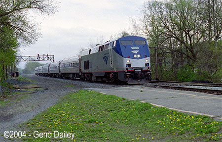 Train #287 passing through Amsterdam at 1:35pm. This is another train that will not be stopping here for the summer of 2004 due to CSX trackwork. It is thought that eliminating this stop will allow the train to maintain it's already heavily padded schedule through the work areas. This stop is set to be restored in the Fall of 2004.