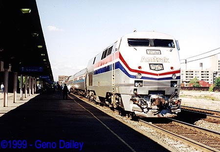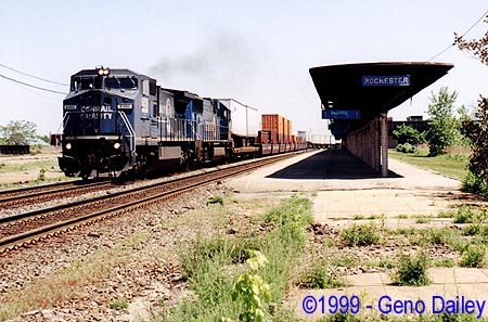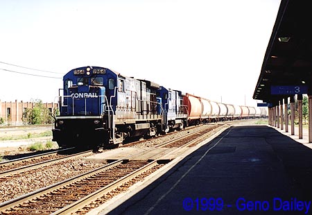 Today, I took a quick Amtrak Trip over to Rochester, New York. The trip travels over the Chicago Line and with your scanner, you should be able to pick up DED/HBD's in Lancaster, Batavia, Churchville and Coldwater, before entering Rochester. Also on the way, you pass by the connection to the West Shore Branch at CP-382. This is a nice hour-long trip and the Rochester Amtrak Station is a pretty good place to trainwatch. While at the station, you may see some local trains including YRO-16 and YRO-18. Conrail's (CSX's after June 1st, 1999) Goodman Street Yard is just to the east of the station, which is located at Milepost 371. Here is what I photographed at the Amtrak Station today...