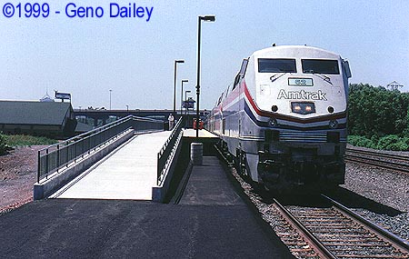 Running 3 hours late, is Amtrak's Train #48, the Lake Shore Limited. This train usually has 2 P42DC's for power, but on occasion will have an F40 in its consist. This train had its usual consist, including 3 road railers on the end. During the trip that morning that I took on Train #286, Amtrak had several passengers get on the wrong train because they thought #286 was #48. Normally, this train comes into Buffalo less than an hour after sunrise during the summer months, making it very difficult to photograph, but today I got lucky, and it was late. |