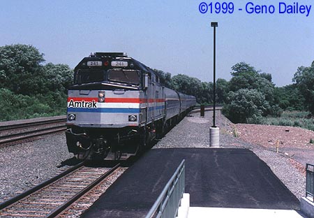 Arriving from New York, bound for Toronto is Amtrak Train #63, the Maple Leaf with F40PH #241 with its usual 4 coach 1 Amdinette consist at 12:59pm, about 14 minutes late. This train has something different from most Empire Service trains, in the Amdinette, there are only Coach Seats on either end of the car instead of Custom Class Seating on one end, the Bar in the middle and tables on the other end, I was told by someone from Amtrak that trains going to Canada are set up this way... |