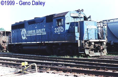 Later on, I headed over to the other side of the small switching yard in Sandusky, and this GP40-2 #3310, still in full Conrail Paint was sitting parked on a yard track. This unit sometime in the near future will become Norfolk Southern #3018. Although not visible in the photo, NS has already installed ditch lights on the rear of this unit. |