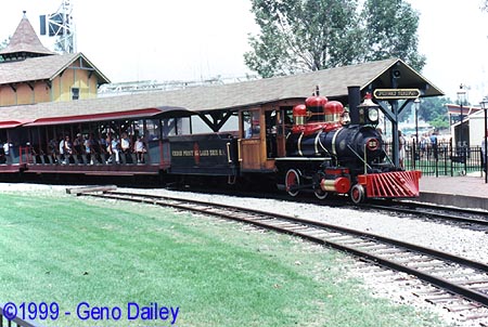 Arriving at the Main Midway Station, one of the 2 Cedar Point & Lake Erie trains prepares to make its stop to pick up and drop off passengers. |