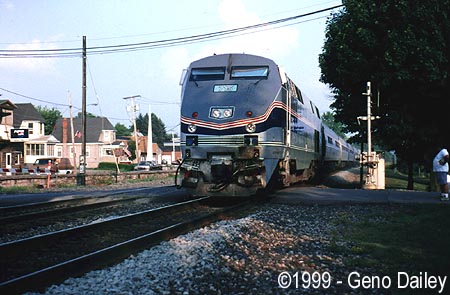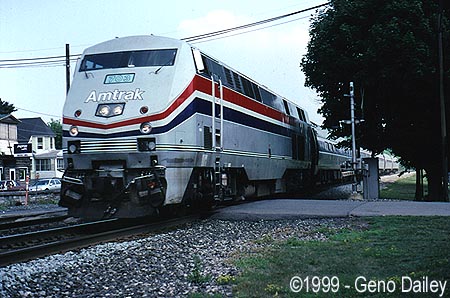 We see in this photo, Amtrak Train #281, the Niagara Falls-bound Mohawk passing by Guy Park on Track #2 preparing to make its station stop just west of where I was standing to take this slide at 3:25pm. Today, the train had P32AC-DM #703 for power.