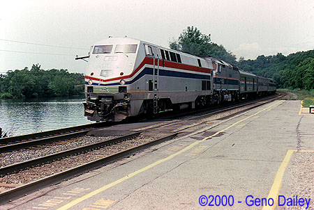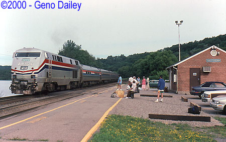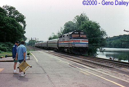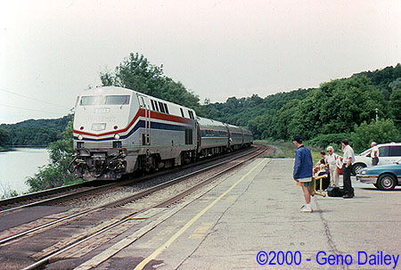 The next Amtrak train to arrive is Train #63, the "Maple Leaf", bound for Toronto with its trusty F40 leading, today's unit being #273. The man holding the step box is the station caretaker who is chatting with Bill just as the train arrives in Amsterdam on Track #2.