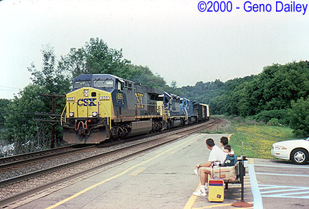 The first freight of the day was this Eastbound Manifest with AC6000CW #609 leading on Track #2 at 10:50am while a family waiting for the next Amtrak Train looks on.