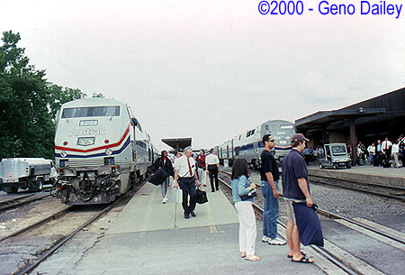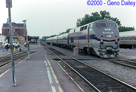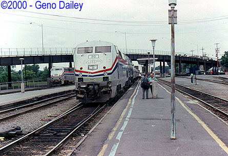 I got off my train in Albany and pretty much felt like a kid in a candy store, if you know what I mean!!! First, I never saw so many Amtrak trains in one area before (I've never been to New York City or Chicago) so this was big!!! The platforms at the Albany station are long enough for many different photo angles and since there are 3 actual tracks that the trains park at, there are lots of trains to photograph on any given day. For easier reference throughout this section of the report, I'll list the numbers of the trains seen here followed by their names, here's the list: |
