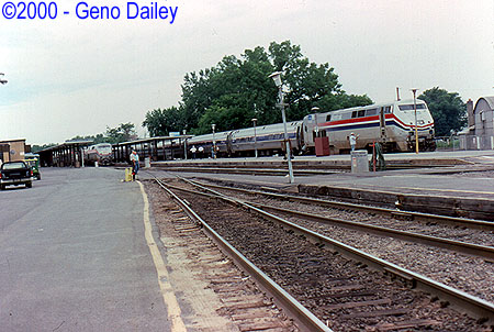 Amtrak Train #283 in a wide shot just departing from Albany.
